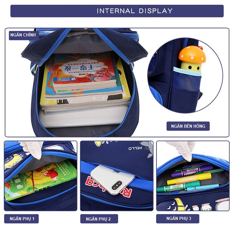 –thiết kế 1 ngăn chính to, bên trong có nhiều ngăn phụ, phía trước 2 ngăn phụ và 2 ngăn bên hông, thuận tiện cho việc sắp xếp các vật dụng. Ngăn lớn rộng rãi để bé đựng đồ như quần áo, mũ, sách vở, tài liệu… trong khi đó, ngăn phụ nhỏ vừa bên ngoài tiện lợi cho bạn lấy các đồ vật hay dùng như khẩu trang, khăn tay,…dễ dàng hơn