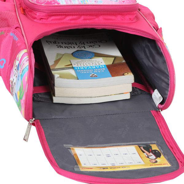 Balo được thiết kế với 1 ngăn chính rộng rãi cho bé đựng cặp sách và các ngăn phụ giúp bé phân chia sách vở và các dụng cụ học tập. Ngoài ra, hai bên hông balo còn có ngăn để bình nước hoặc dù tiện lợi cho các bé.