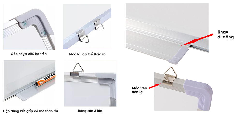 - Chất liệu: mặt bảng từ tính, khung nhôm chống rỉ, bo bảng bằng nhựa.