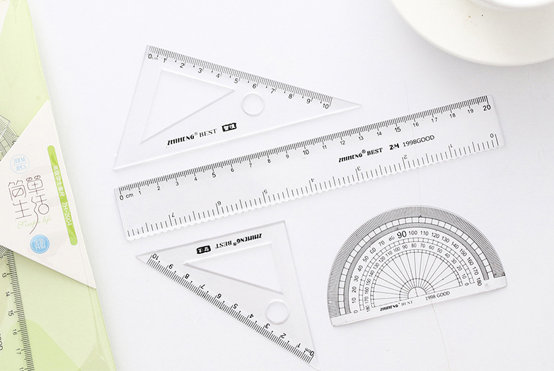 | Kích thước: | Hai thước tam giác 10cm Thước thẳng 20cm Thước đo độ 7cm |