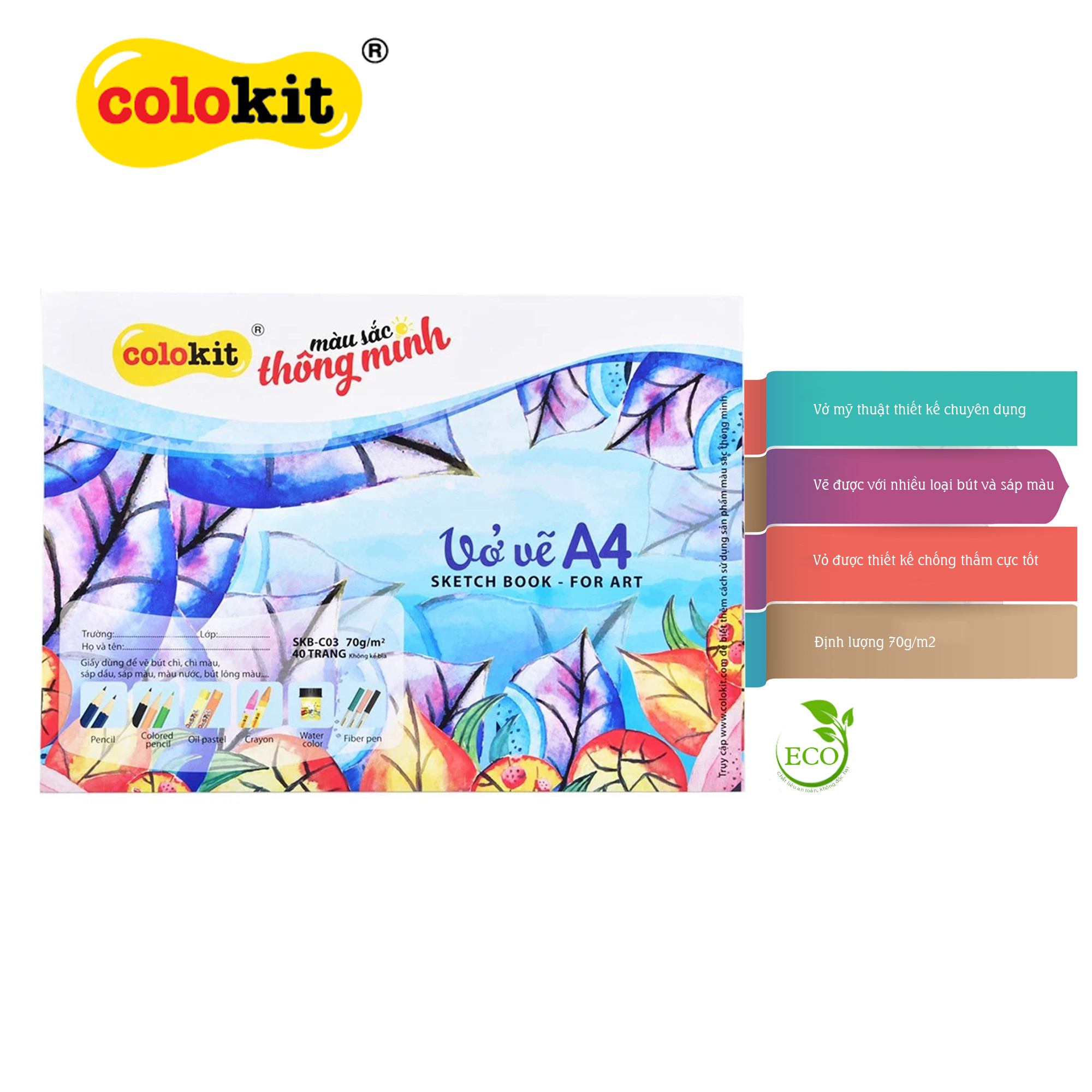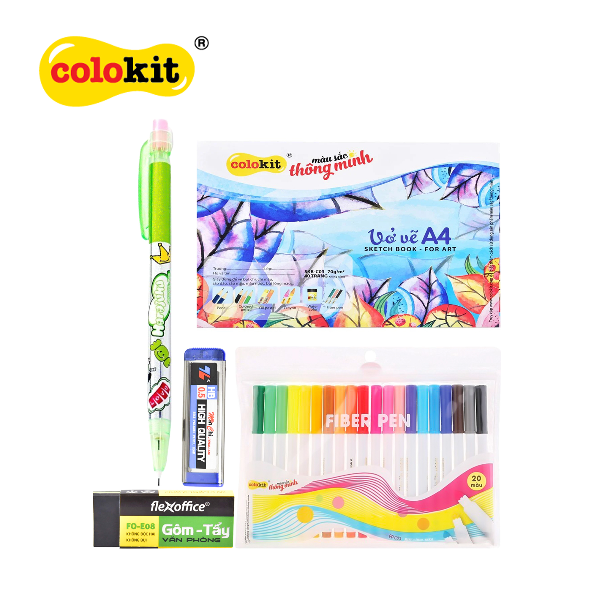 Bộ sản phẩm Combo Fiber Pen Colokit bao gồm : 01 Bộ 20 cây bút lông màu FP-C0301 Bút chì bấm PC-01801 Vở vẽ A4 SKB-C0301 Min chì PCL-0301 Gôm FO-E08