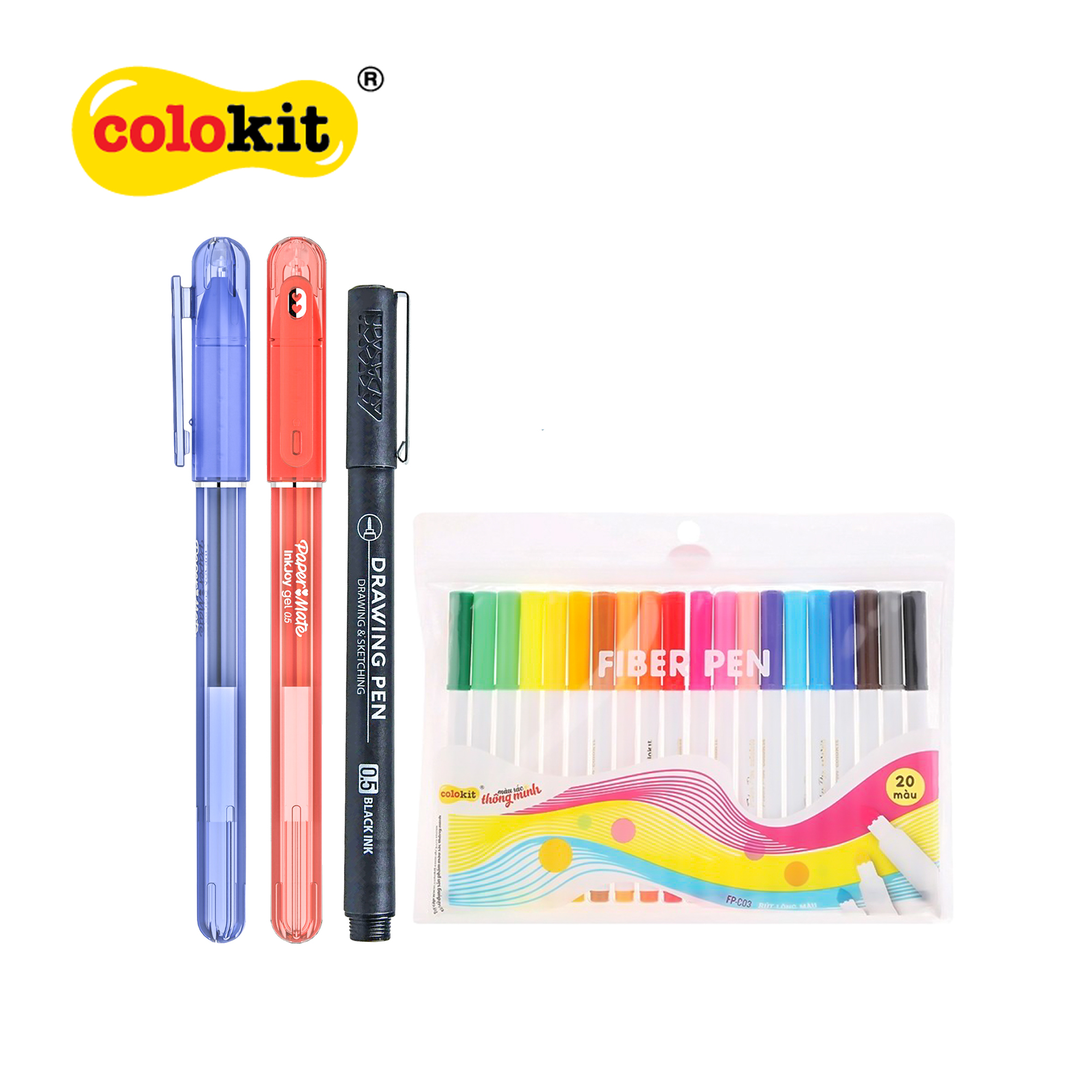 Bộ sản phẩm Combo Fiber Pen Colokit bao gồm : 01 Bộ 20 cây bút lông màu FP-C0301 Bút vẽ kỹ thuật BIZ-DW0101 Bút Gel Papermate 400St 0.5 (Màu xanh dương)01 Bút Gel Papermate 400St 0.5 (Màu...