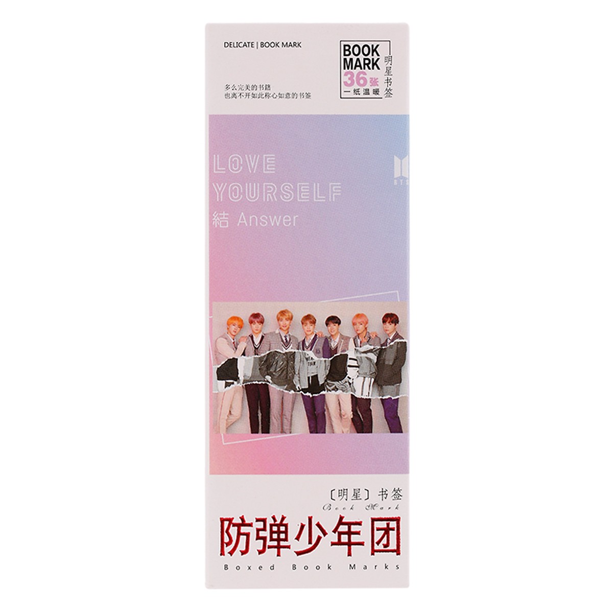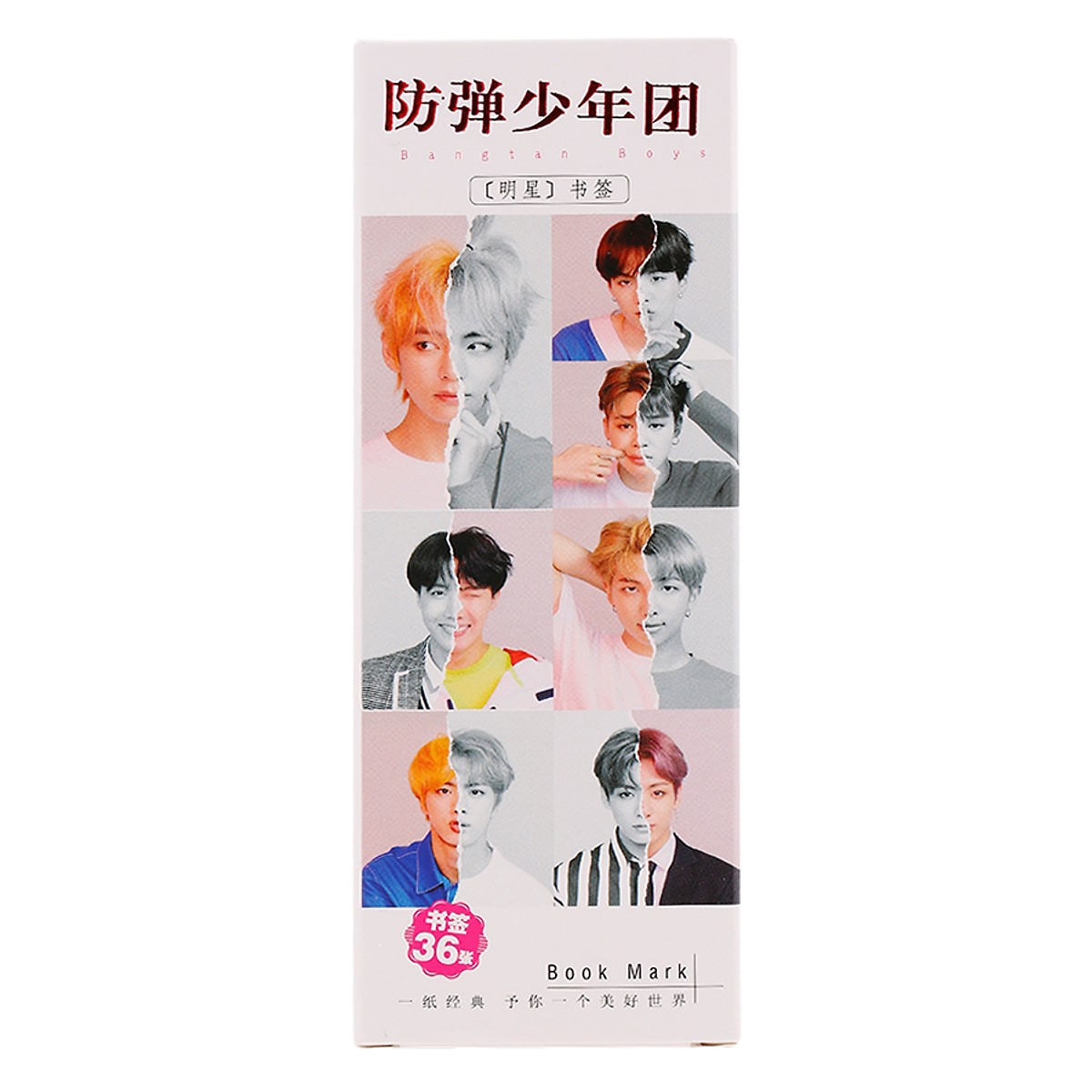 Bộ bookmark BTS bao gồm 36 tấm ảnh, tổng hợp những hình ảnh đẹp hot nhất của các oppa nhà BTS trong những album mới nhất, đảm bảo sẽ là món quà ý nghĩa và thiết thực với ARMY, dùng để đánh dấu sách, tập san, album, hay bản kế hoạch, nhật ký