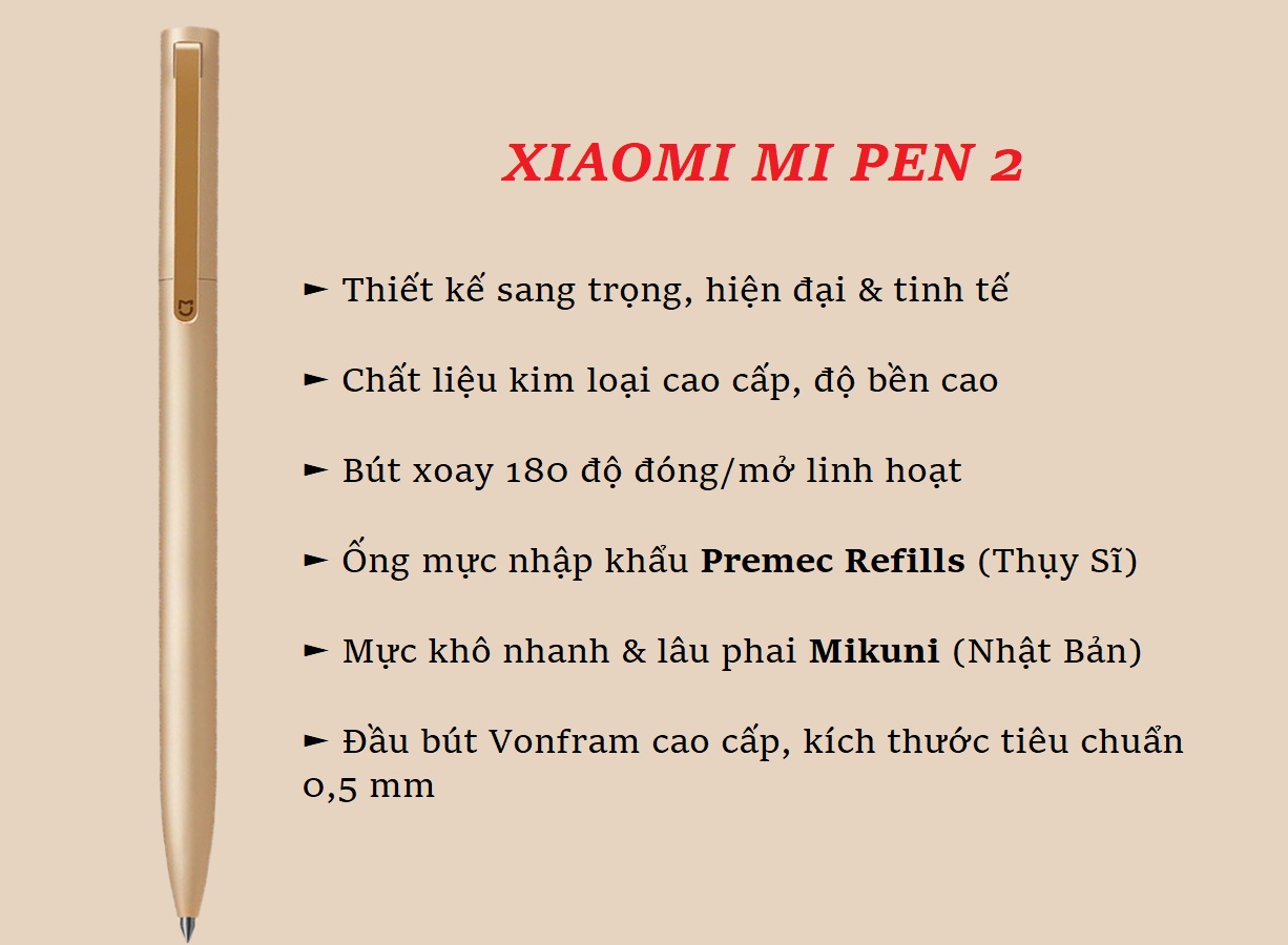 1. Thông số sản phẩm Sản phẩm Xiaomi Mi Pen 2 Chất liệu Hợp kim nhôm Kích thước 140 x 9,5 mm Màu bút Vàng đồng Khối lượng 26 g Màu mực Đen 2. Đặc điểm sản phẩm Sản phẩm chính hãng từ...