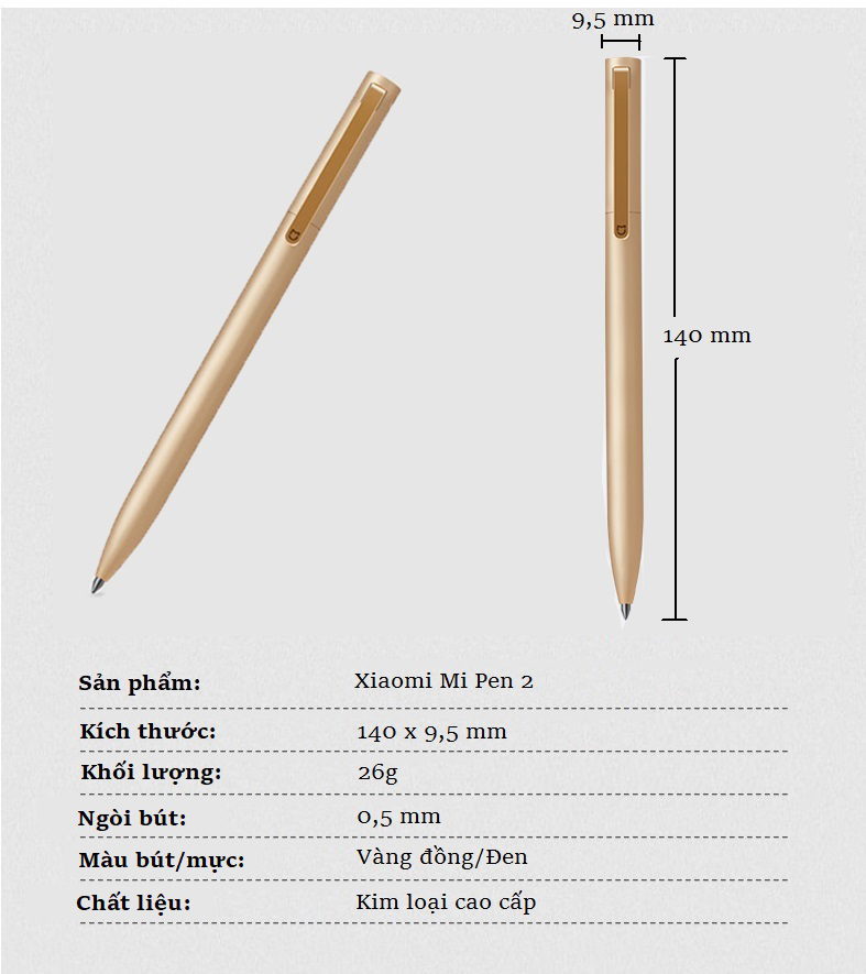 | Kích thước | 140 x 9,5 mm | Màu bút | Vàng đồng |