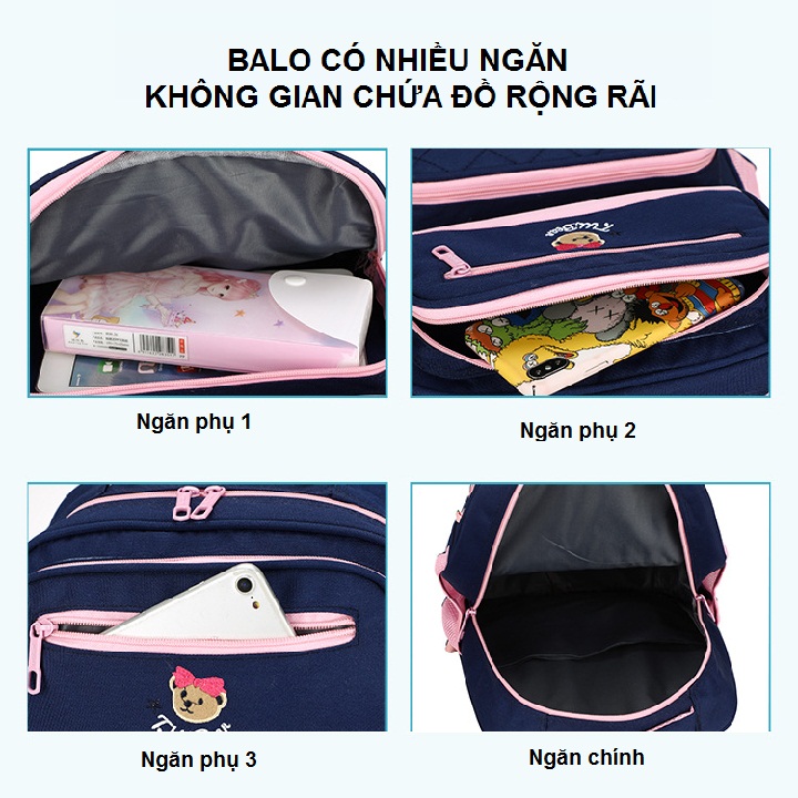–thiết kế 1 ngăn chính to, 3 ngăn phụ phía trước và 2 ngăn bên hông, thuận tiện cho việc sắp xếp các vật dụng. Ngăn lớn rộng rãi để bé đựng đồ như quần áo, mũ, sách vở, tài liệu… trong khi đó, ngăn phụ nhỏ vừa bên ngoài tiện lợi cho bé lấy các đồ vật hay dùng như khẩu trang, khăn tay,…dễ dàng hơn