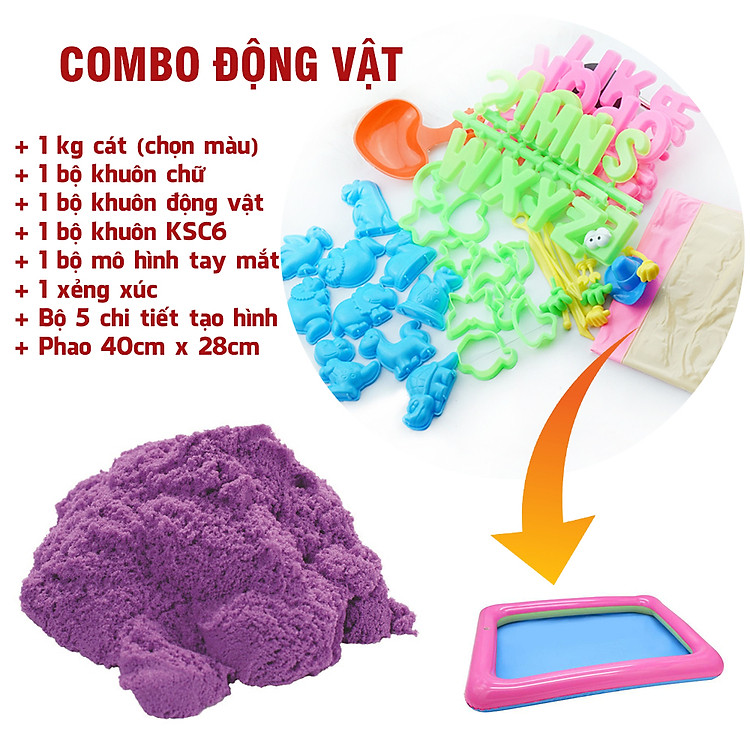 Có 2 loại combo: BỘ COMBO LÂU ĐÀI VÀ BỘ COMBO ĐỘNG VẬT Combo lâu đài gồm: 1 kg cát - màu quý khách tự chọn : Giá lẻ 55k/kg 1 bộ khuôn số từ 1 đến 9, dấu cộng, trừ, nhân chia. Giá lẻ 27k/bộ 1 bộ khuôn...