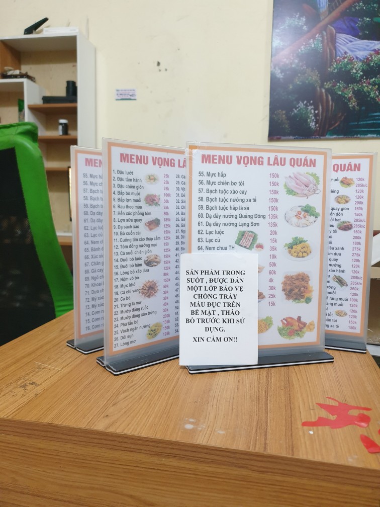 Bảng Menu Mica để bàn dùng làm thực đơn, vật dụng không thể thiếu trong quán của bạn. Menu Mica trong suốt, sử dụng được cả 2 mặt Được làm từ mica Đài Loan chất lượng cao Đường nét gia công tinh xảo...