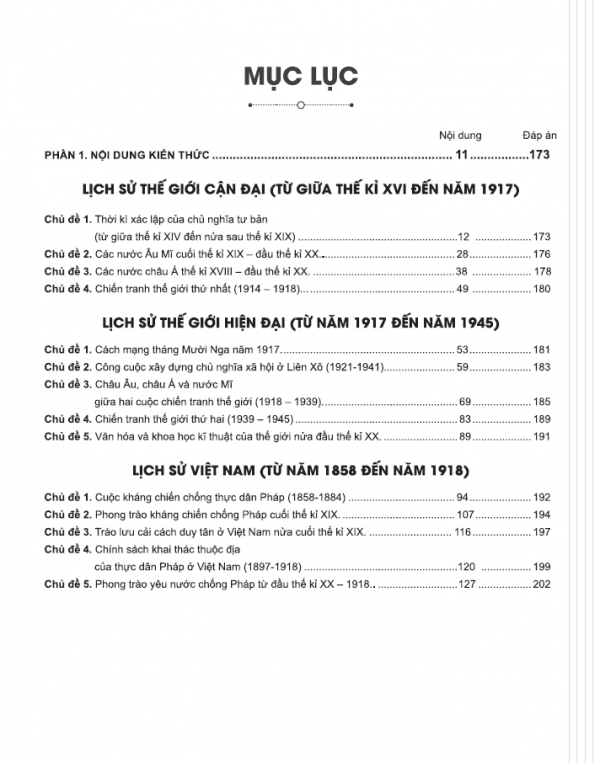 Được chia thành 3 phần: Lịch sử thế giới cận đại (Từ giữa thế kỉ XVI đến năm 1917) với 4 chủ đề, Lịch sử thế giới hiện đại (Từ năm 1917 đến năm 1945) với 5 chủ đề và Lịch sử Việt Nam (Từ năm 1858 đến năm 1918) với 5 chủ đề.