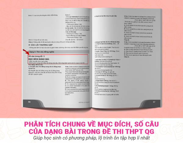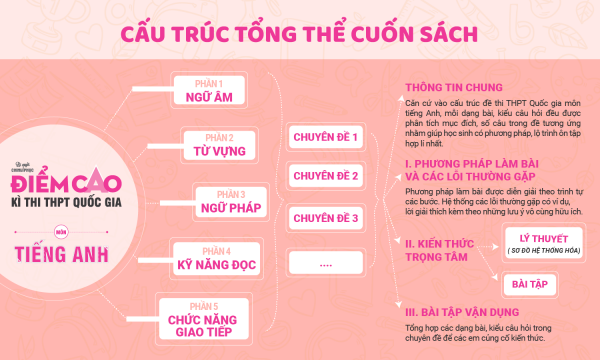 Căn cứ vào cấu trúc đề thi THPT Quốc gia môn tiếng Anh, mỗi dạng bài, kiểu câu hỏi đều được phân tích mục đích, số câu trong đề tương ứng nhằm giúp học sinh có phương pháp, lộ trình ôn tập hợp lí nhất.