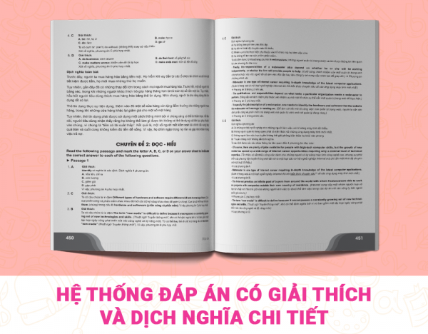 Phần 3: Lời giải chi tiết và dịch nghĩa từng câu của toàn bộ 20 đề: Ngoài bảng đáp án, từng câu hỏi còn có phần giải thích phương án A, B, C, D và dịch nghĩa sang tiếng Việt (kể cả bài đọc). Giúp học sinh hiểu rõ xem chúng sai ở đâu, đúng thế nào.
