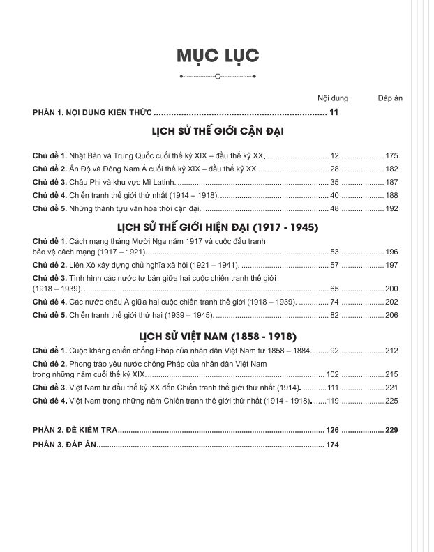 Được chia thành 3 phần: Lịch sử thế giới cận đại, Lịch sử thế giới hiện đại (1917 – 1945), Lịch sử Việt Nam (1858 – 1918).