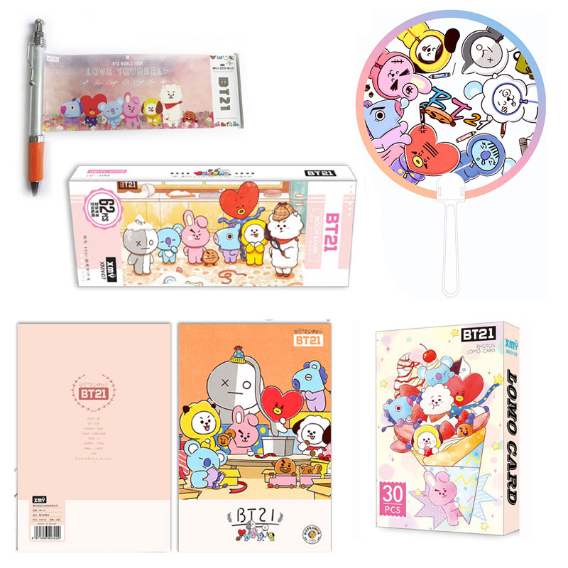 Gồm: vở BT21, bút kéo BT21, bookmark BT21, quạt BT21 trong suốt. ảnh thẻ BT21 lomo card