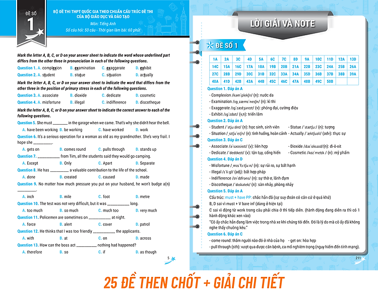 Bộ đề bao gồm 25 đề thi then chốt chuẩn cấu trúc, tương đương với 25 lần làm bài thi thật, được chọn lọc, biên soạn bao quát mọi dạng bài, đón đầu các vấn đề mới nhất xuất hiện trong kỳ thi THPT Quốc gia 2021.