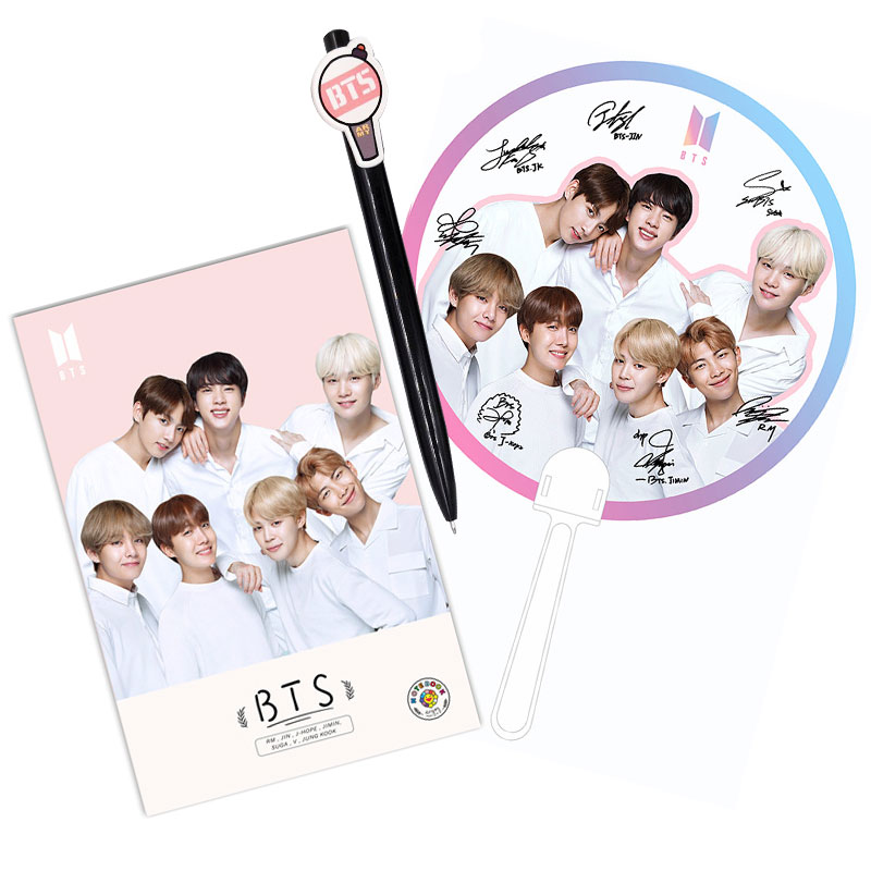 Combo BTS gồm: 1 quạt BTS có chữ ký, 1 bút bi BTS lightstick, 1 cuốn vở kẻ ngang BTS