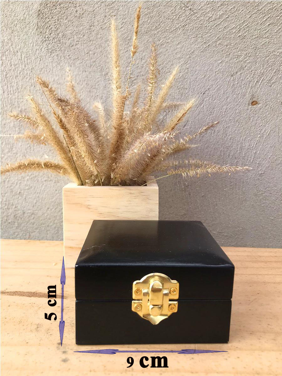 Hộp để trang sức, vòng , nhẫn Chất liệu: gỗ được sơn đenKích thước: ngang 9 cm sâu 5 cm cao 5 cmMàu sắc: sơn đenHộp đựng nhẫn có khóa chắc chắnMặt trong có mút được chia các khe để nhẫn , bông tai,...