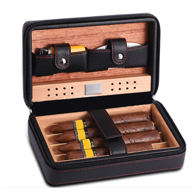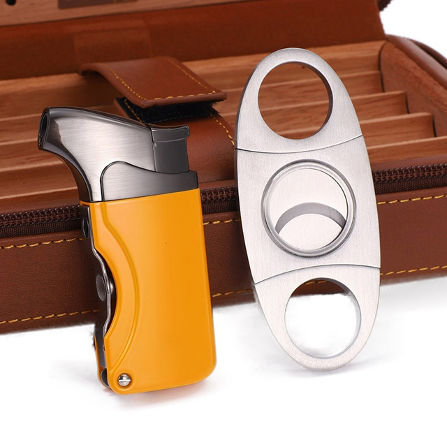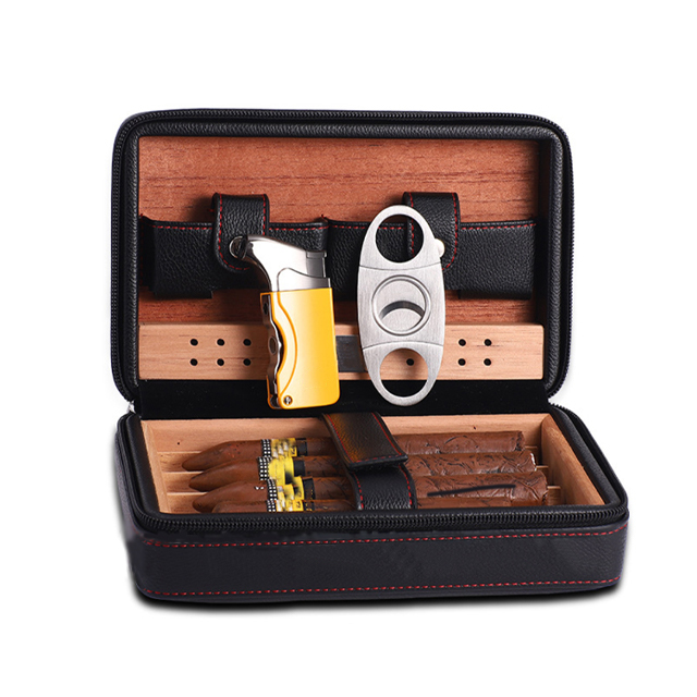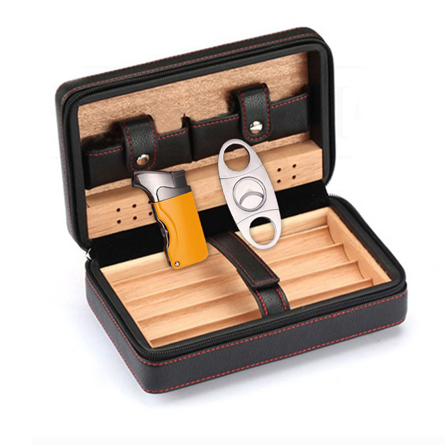 Hộp Đựng Xì Gà 4 Điếu Kèm Bật Lửa Và Dao Cắt HANNI-T104 (hộp đựng màu đen - bật lửa mẫu ngẫu nhiên)