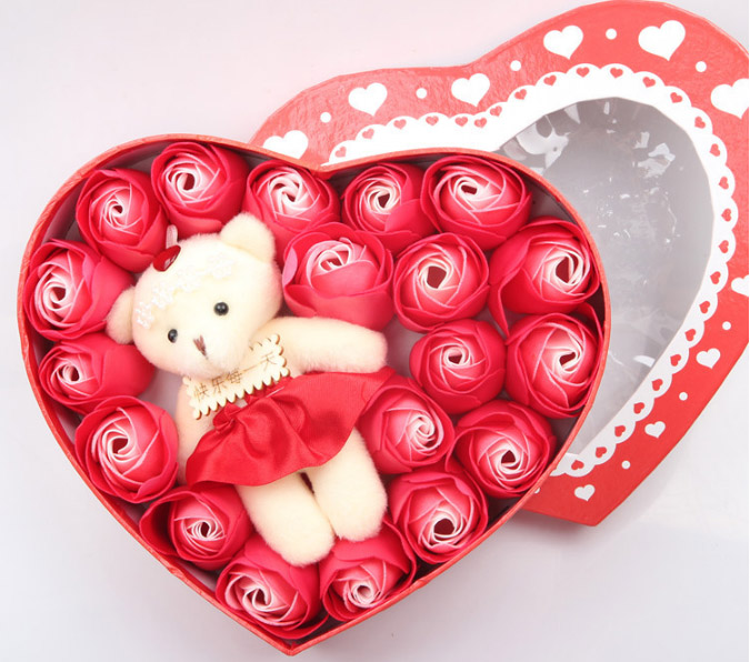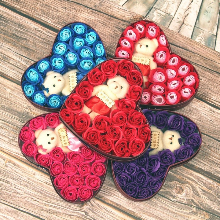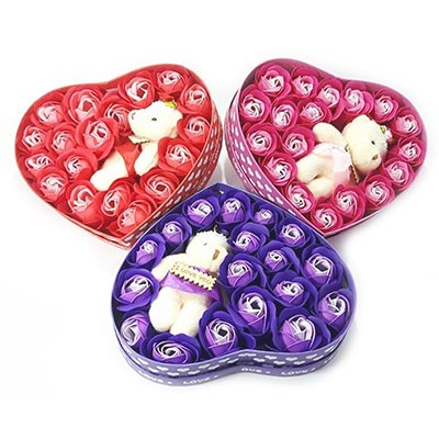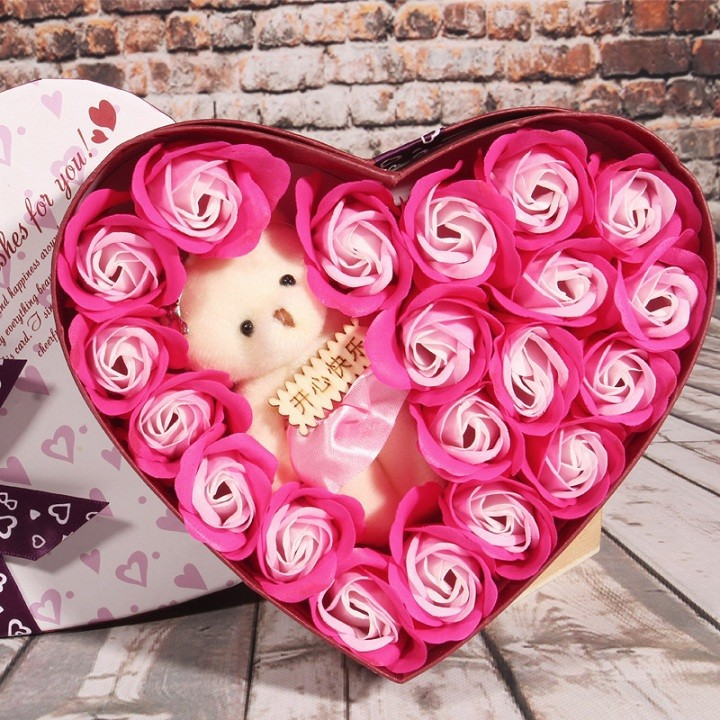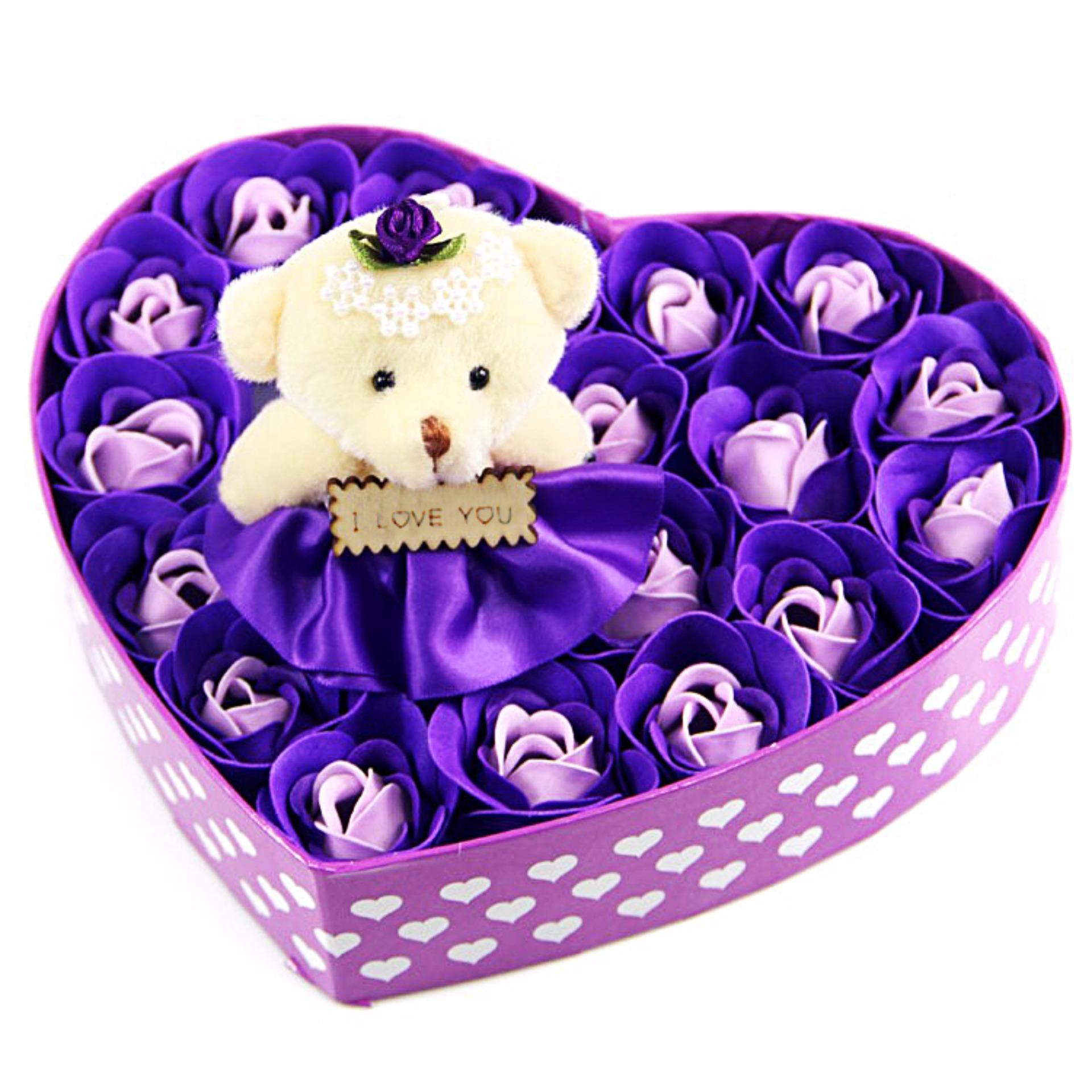 Hộp Hoa Hồng Trái Tim 17 Bông Kèm Gấu- Giao Màu Ngẫu Nhiên