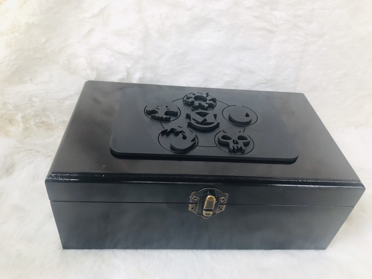 Hộp quà bằng gỗ màu đen hơi nâu, hộp để bài tarot huyền bí với các biểu tượng độc đáo được khắc nỗi trên bề mặt hộp vô cùng lạ mắt