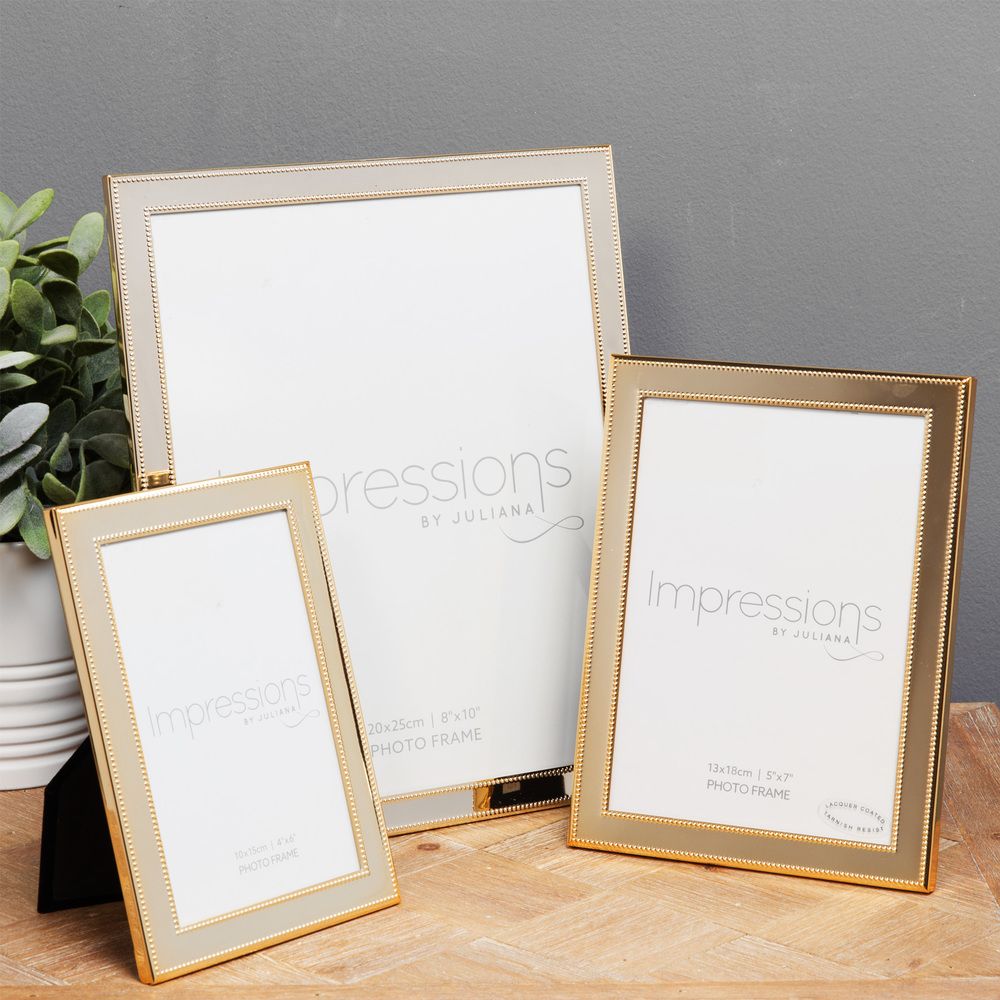 Khung được làm từ chất liệu nhôm cao cấp sáng bóng, màu đồng nhã nhặn với viền hạt độc đáo. Thiết kế đơn giản nhưng sự phối hợp hài hòa giữa kiểu dáng, chất liệu, màu sắc giúp cho sản phẩm dễ dàng nổi bật tại bất kì góc trang trí nào. Ngoài ra, Khung ảnh viền hạt 4"x6" Lovely Land FB10146 còn phù hợp làm quà tặng sang trọng và ý nghĩa.