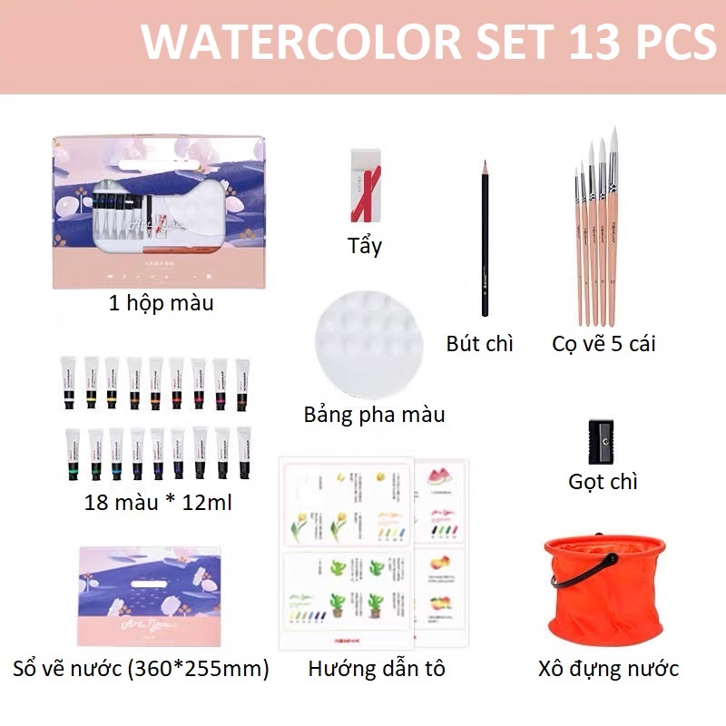 Màu nước dạng tuýp set 18 màu cao cấp đi kèm bộ dụng cụ vẽ tranh màu nước chuyên nghiệpBao gồm :1 hộp màu nước 18 tuýp x 12ml1 cục tẩy1 bút chì1 bảng pha màu5 cọ vẽ các size khác nhau1 gọt bút chì1...