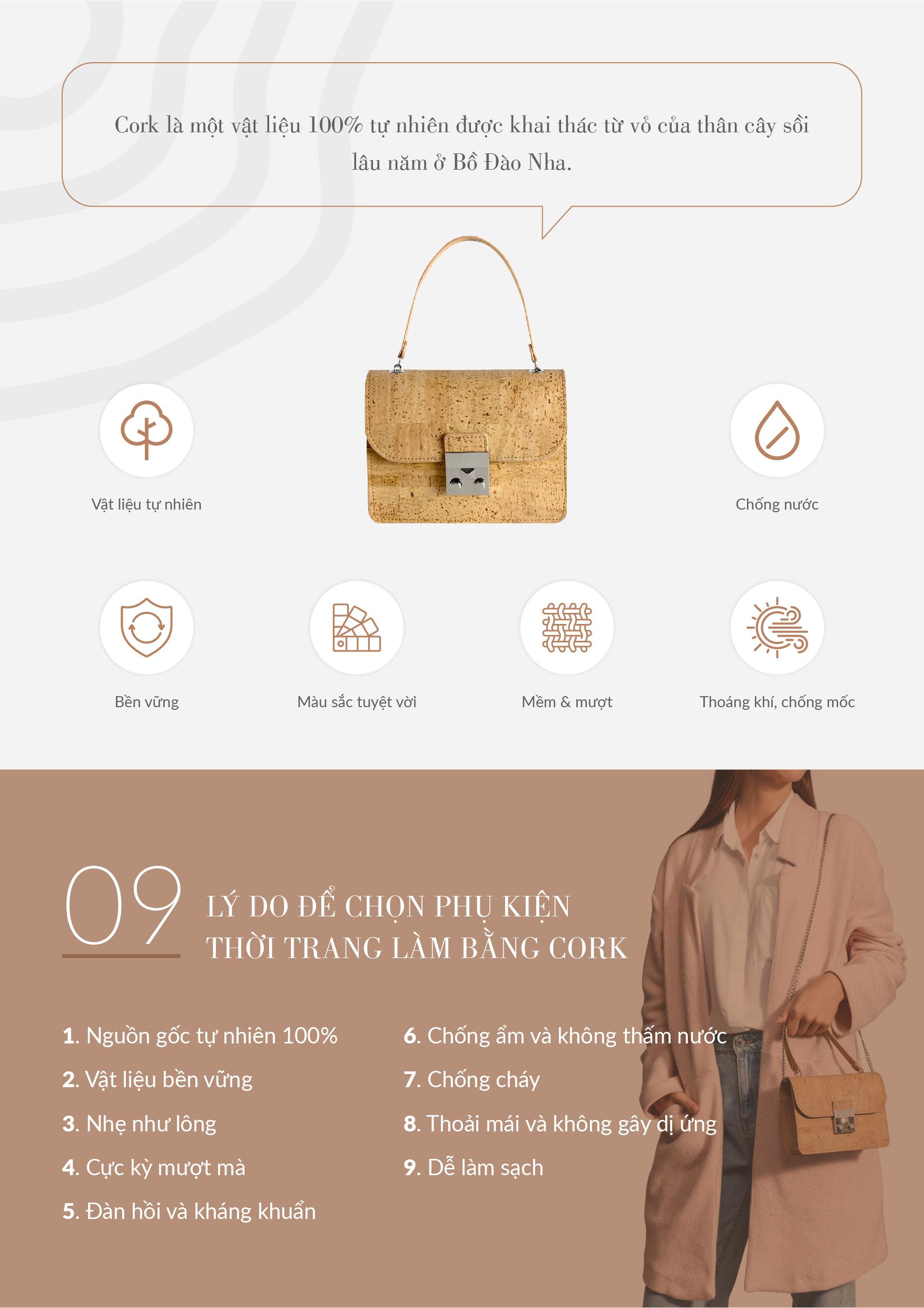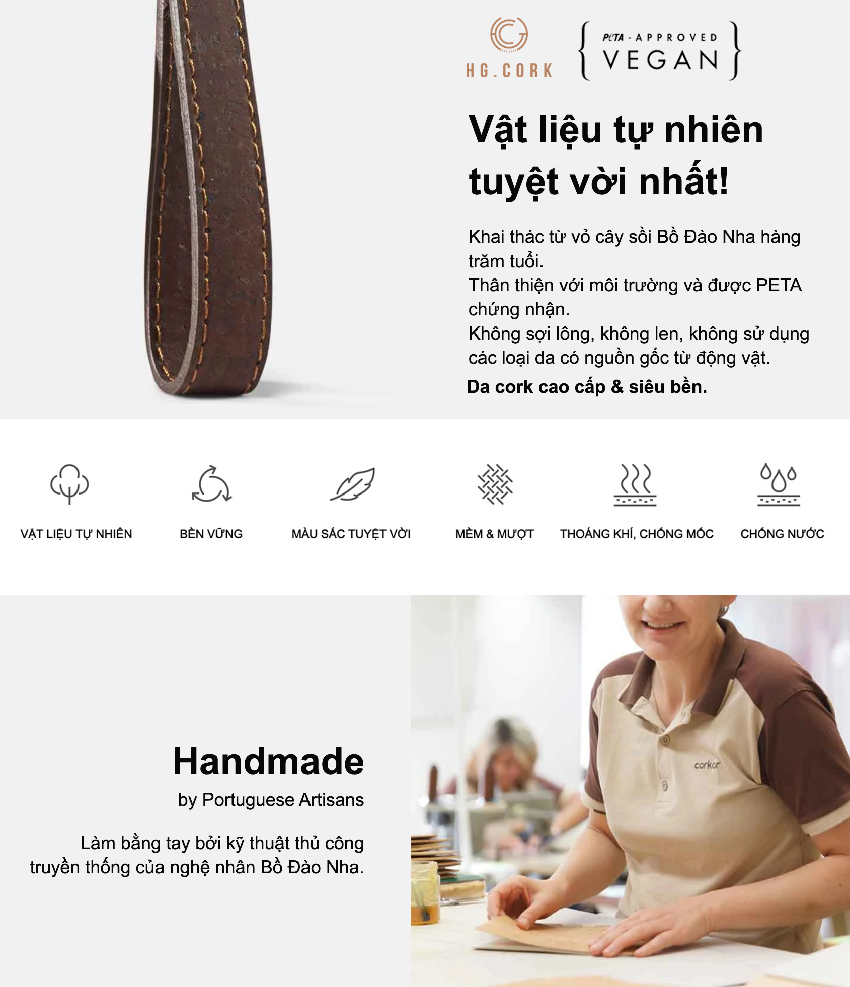 - Chất liệu: làm từ da cork thực vật thuần chay Bồ Đào Nha kết hợp với kim loại