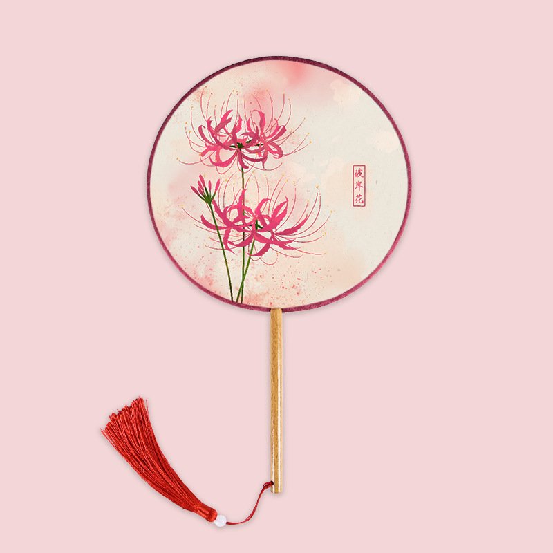 Quạt tròn cổ trang mẫu cầm tay cán dài M65 in hình hoa bỉ ngạn