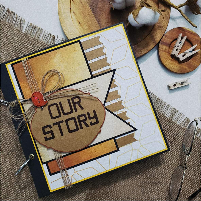 Scrapbook “OUR STORY” với tone màu chủ đạo là đen, nâu và vàng. Quyển scrapbook mang hơi hướng cổ điển với tone màu ấm áp này sẽ làm người nhận vô cùng hạnh phúc.