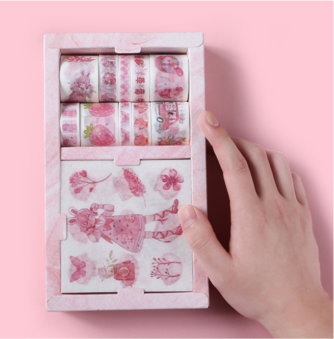 Set Combo Hộp 10 cuộn Washi tape và 10 Hình Dán Sticker Cao Cấp Họa Tiết Cô Gái Dễ Thương