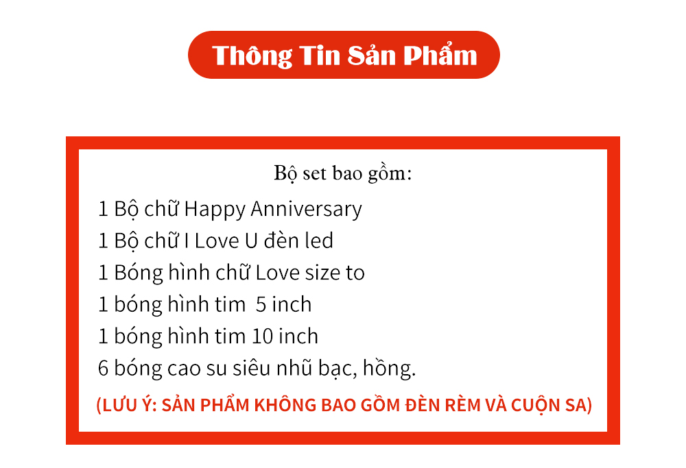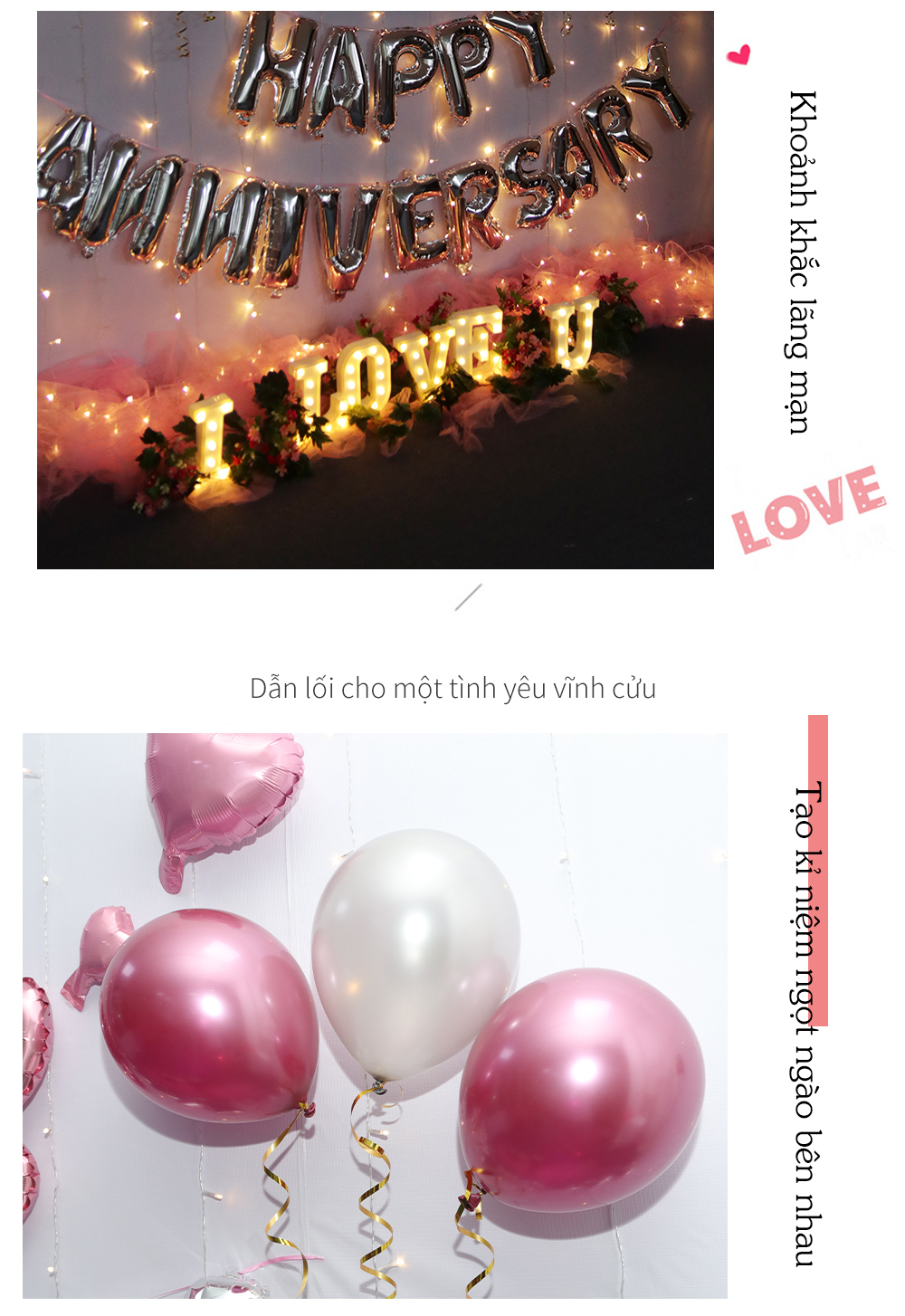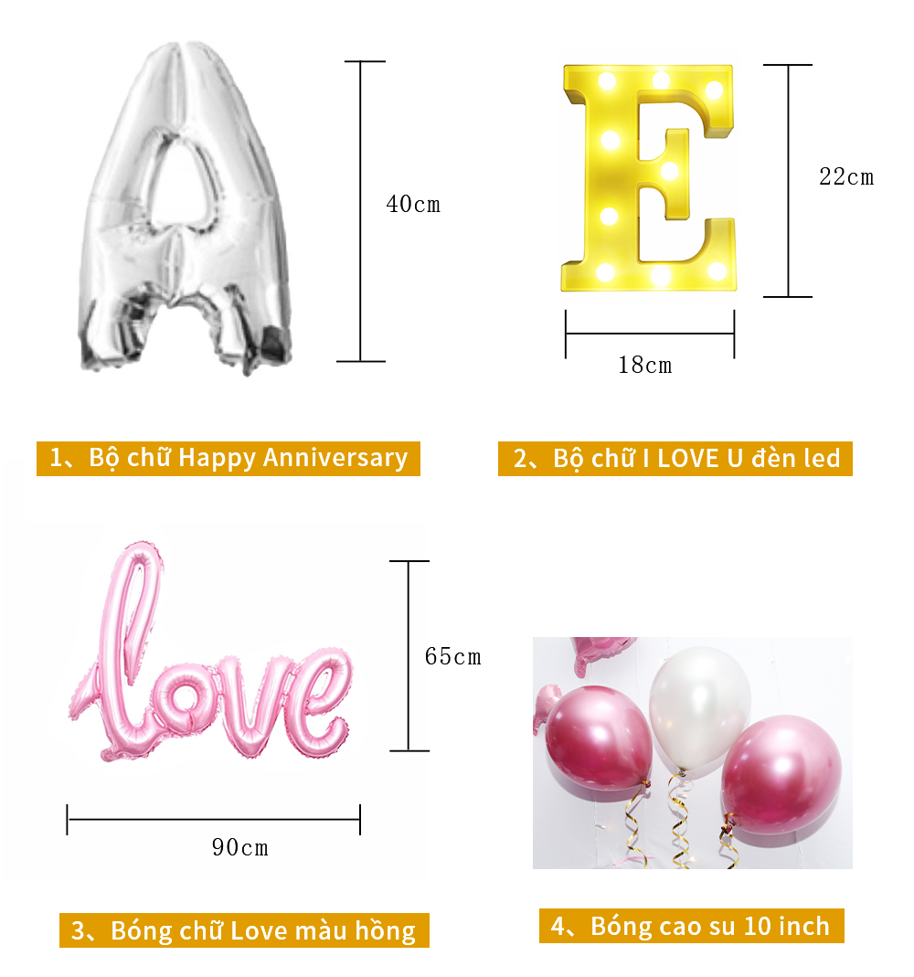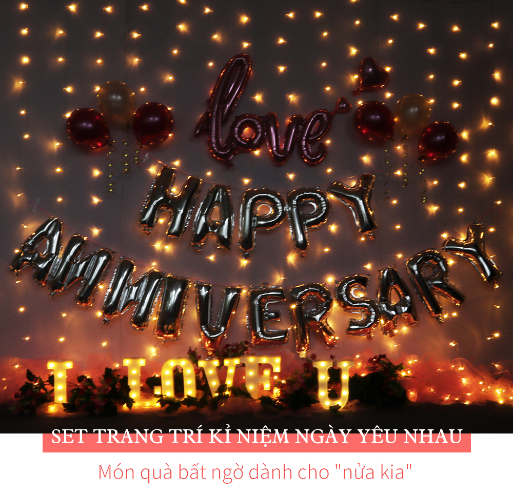 Vui lòng đọc kĩ thông tin sản phẩm giúp shop nhé: Bộ sản phẩm bong bóng trang trí ngày anniversary ngọt ngào, lãng mạn YBHP-066 gồm có: Bộ chữ HAPPY ANNIVERSARY 16 chữ cái màu bạc 1 bộ chữ đèn led I...