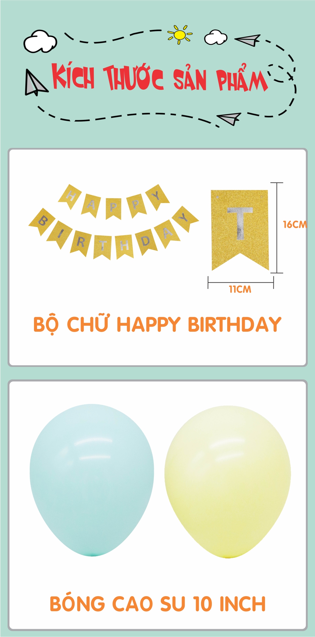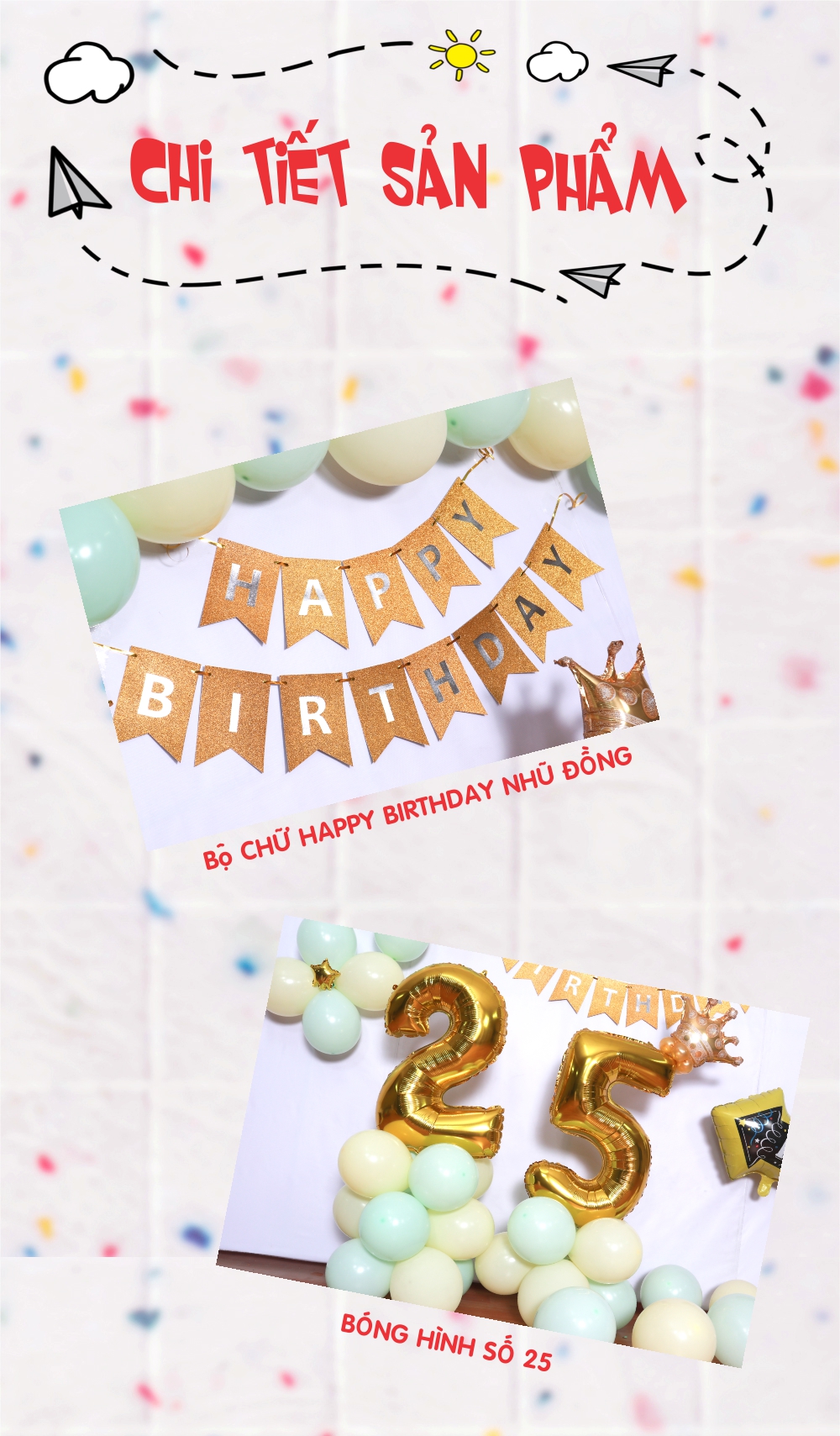 Vui lòng đọc kĩ thông tin sản phẩm giúp shop nhé: Bộ sản phẩm bong bóng trang trí sinh nhật tuổi 25 dễ thương YBHP-066 gồm có: 1 Dây chữ HAPPY BIRTHDAY nhũ vàng 2 bóng số 70cm 7 bóng sao 5 inch 1...