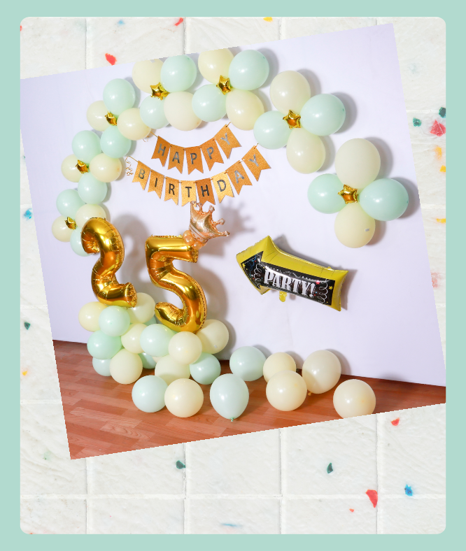 Set trang trí sinh nhật tuổi 25 xinh xắn, dễ thương cùng dây cờ nhũ lấp lánh, bóng hình, phụ kiện tông vàng, xanh pastel kèm keo dán YBHP-066