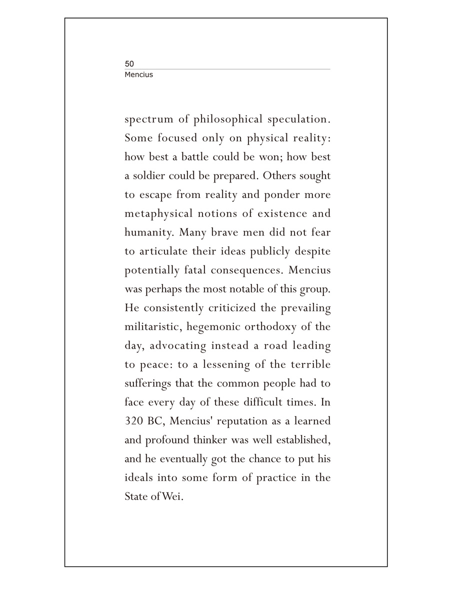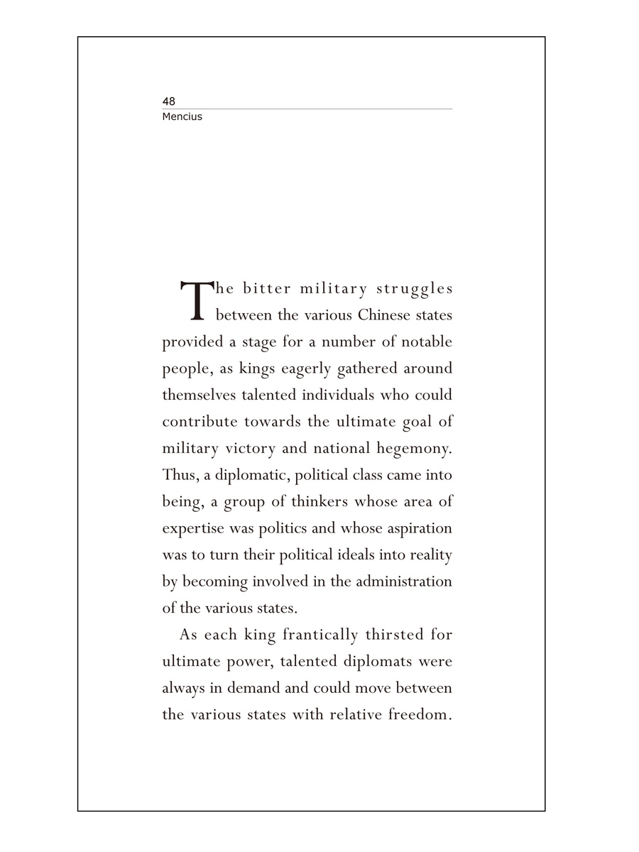 Mencius was the very epitome of benevolence and compassion. He advocated the ideal of “the truly great man”: one whom no amount of money and power could corrupt; whom no pover ty or hardship could dispirit; whom no tyrant or oppressor could silence. This conception of the right way to live one’s life has had a profound influence on Chinese civilization and many of the great minds of successive eras have done their best to live up to these ideals.