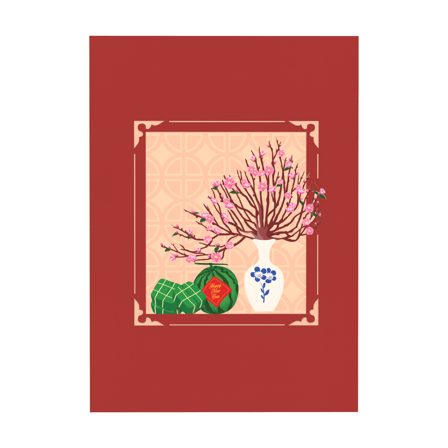 Bao phủ bởi sắc màu đỏ rộn ràng không khí Tết trên bìa thiệp là hình ảnh đôi ba cặp bánh chưng xinh xắn, dưa hấu đỏ với lời chúc “Happy New Year” nổi bật và lọ cành đào thắm tươi. Mỗi cành đều điểm xuyến chi chít những cánh hoa màu hồng quyến rũ, thêm cả màu xanh của lá cây khiến cho cả đất trời như tụ hội về trong khoảnh khắc chạm tay vào thiệp lần đầu tiên.