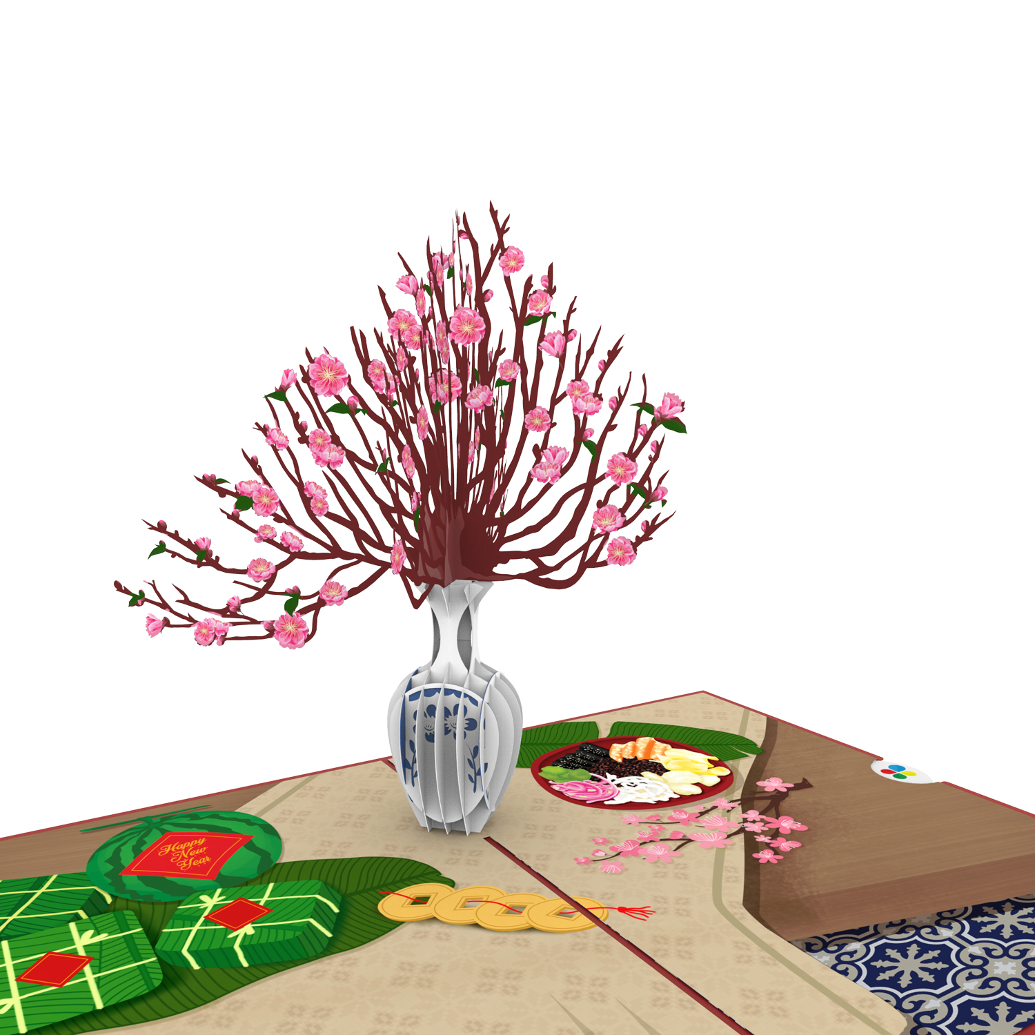 Không gian mùa xuân càng thêm đậm đà hương vị khi bất chợt lật mở chiếc thiệp từ bên trong. Ngày Tết nào có thể thiếu dĩa mứt màu sắc ngọt thơm, lá chuối xanh, xâu đồng tiền vạn phúc, cùng vô vàn bánh chưng, dưa hấu đỏ. Ấy thế mà sao quên được chút hồng hấp dẫn của cành đào được trưng bày vị trí trung tâm. Từng nét 3D chấm phá của lọ hoa đào là từng kỳ công của nghệ nhân với hi vọng sẽ góp chút vui vẻ, cát tường đến tất cả mọi người.