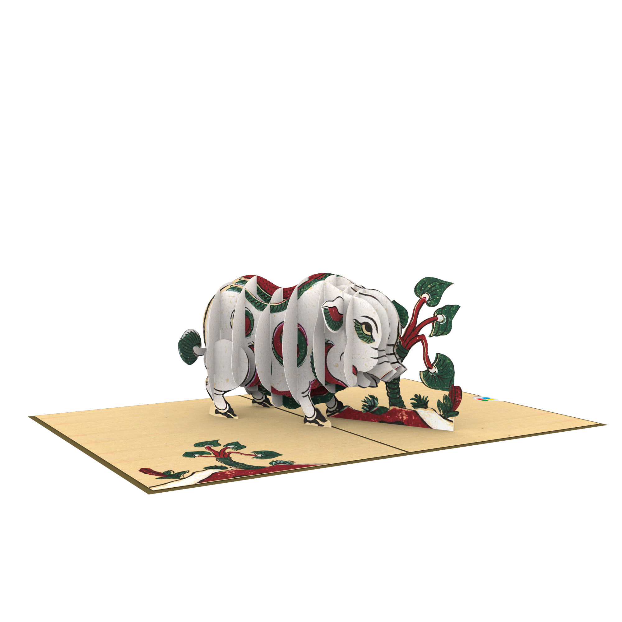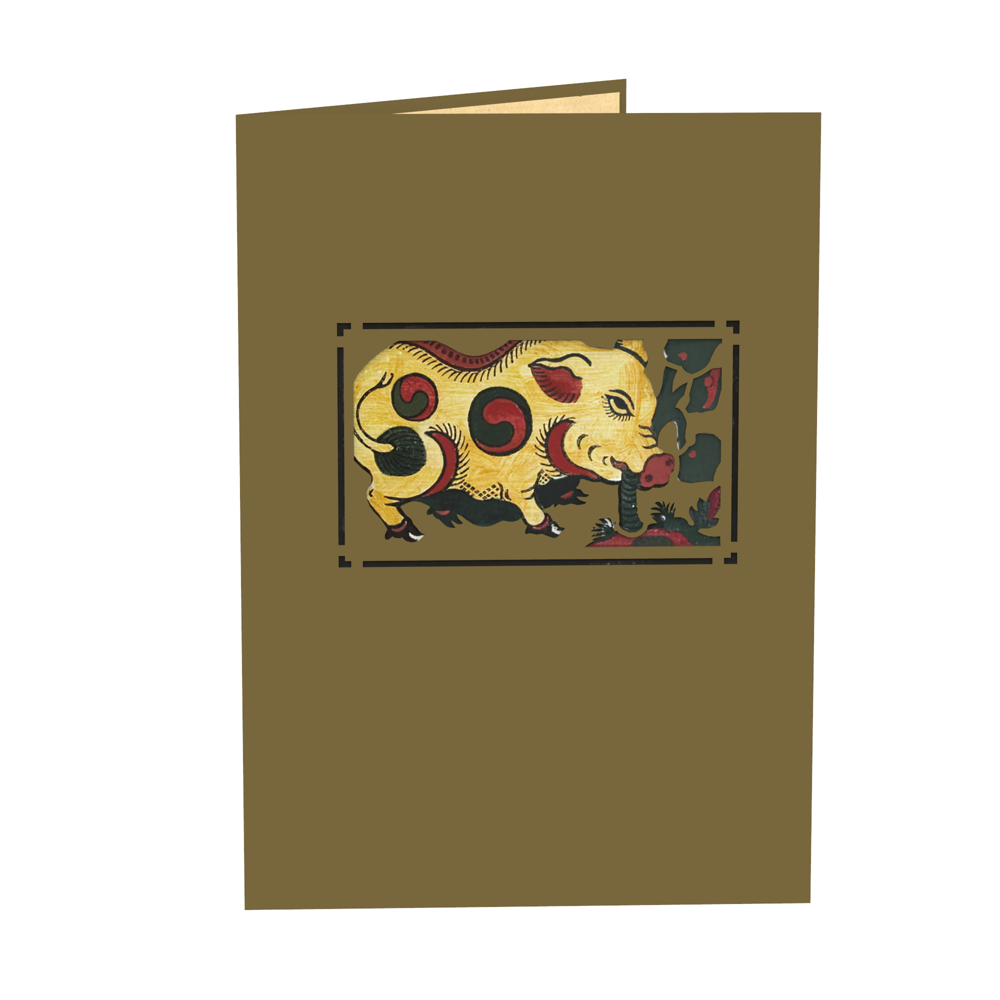Bức tranh Đông Hồ Lợn ăn lá ráy từ lâu đã nổi tiếng qua bao thời gian với hình ảnh chú lợn mủm mĩm đáng yêu đang ngoạm chặt cây ráy. Dựa trên những câu chuyện từ chất liệu dân gian, thiệp 3D pop up Lợn ăn lá ráy đã mang đến dáng hình con vật quen thuộc ngay từ lúc tiếp xúc lần đầu. Với tông màu nâu cổ điển, bìa thiệp làm tăng thêm cảm giác gần gũi khi cầm thiệp trên tay.